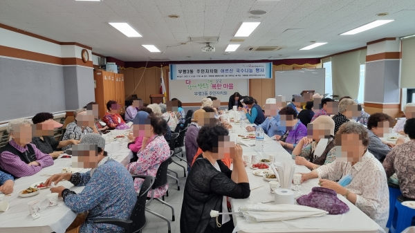 [금요저널] 부평구 부평3동 주민자치회는 지난 9일 동 행정복지센터 다목적실에서 생활이 어려운 저소득층, 취약계층 어르신 200여명을 초대해 국수나눔 행사를 진행했다.