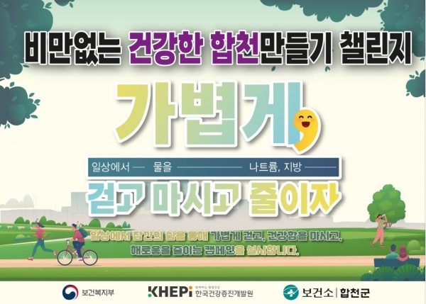 비만없는 건강한 합천만들기 챌린지는 ‘일상에서 걷고 물을 마시고 나트륨 지방을 줄이자’는 실천 약속을 합천군보건소 인스타그램 태그 후 챌린지 사진을 게시하는 캠페인이다.
