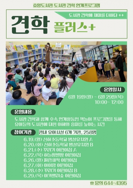 [금요저널] 이천시 효양도서관은 관내 유아시설 6개 기관, 어린이 258명을 대상으로 견학 연계 프로그램 ‘견학 플러스’를 운영한다.