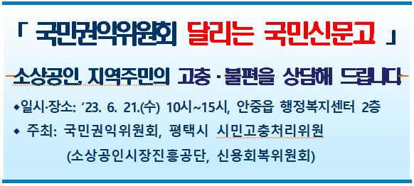[금요저널] 평택시 시민고충처리위원실은 국민권익위원회와 함께 오는 21일 오전 10시부터 오후 3시까지 안중읍 행정복지센터 2층 회의실에서 ‘달리는 국민신문고’를 운영한다.