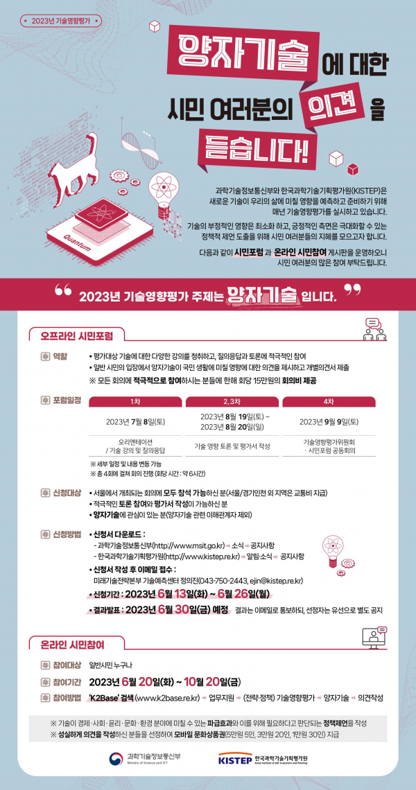 ‘양자’ 기술에 관심이 있는 시민을 대상으로 15명 내외로 구성될 예정이며 ‘양자’ 기술이 국민에게 미칠 수 있는 파급효과에 대해 7월부터 9월까지 총 4회에 걸쳐 심도 있게 논의할 계획이라고 전했다.