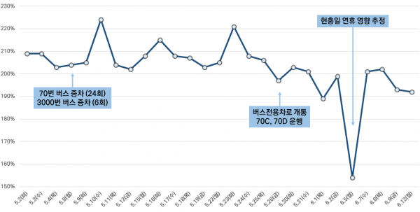 이는 승객의 철도 선호도, 소요시간에 따른 버스증차 대책의 한계에도 불구하고 버스전용차로 개통 및 병목구간 개선으로 ‘고촌→김포공항’ 통행시간이 6.5~9.7분으로 단축되어 시간경쟁력이 일정 수준 확보된 데 따른 것이다.