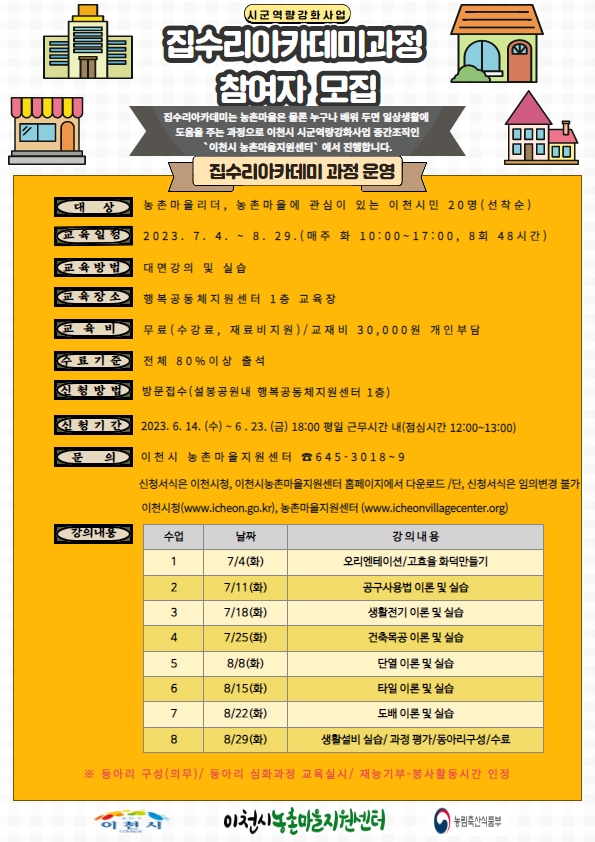 교육비와 재료비 등 무료과정으로 총 8회 48시간 중 대부분을 실습 위주로 진행되는 이번 집수리아카데미 과정에 참여하실 분은 이천시 홈페이지 또는 이천시 농촌마을지원센터 홈페이지 공지사항을 참고해 6월 23일까지 근무시간 내 방문접수하면 된다.
