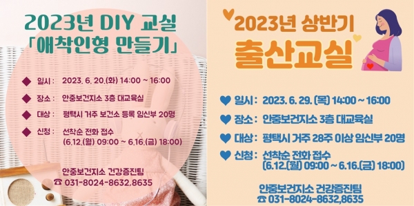 [금요저널] 평택시 안중보건지소에서는 임신부의 태교 활동 및 건강한 출산을 위한 정보 제공을 위해 DIY 교실 ‘애착인형 만들기’ 프로그램은 6월 20일에, ‘상반기 출산 교실’ 프로그램은 6월 29일에 각각 운영한다.
