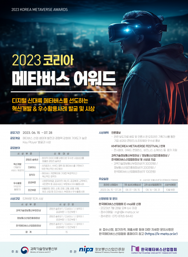 [금요저널] 과학기술정보통신부는 국내 가상융합세계 산업 혁신 선도 주자 발굴을 위한‘2023 코리아 메타버스 어워드’모집을 6월 15일부터 진행한다고 밝혔다.