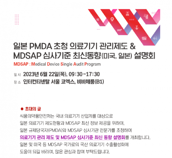[금요저널] 식품의약품안전처는 의료기기 수출을 지원하기 위해 업계 GMP 담당자 등을 대상으로 일본의 의료기기 GMP 제도 현황을 소개하고 미국·일본에서 의료기기 공동심사 프로그램 관련 심사대응 요령 등에 대한 설명회를 2023년 6월 22일 개최한다.