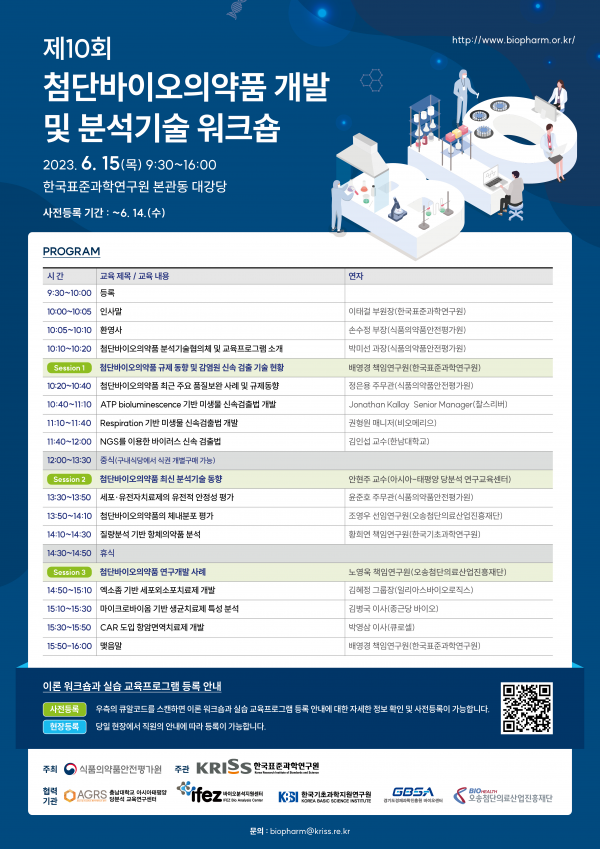 [금요저널] 식품의약품안전처 식품의약품안전평가원은 첨단바이오의약품 분석 분야의 규제과학 전문인력을 양성하기 위해 국내 전문 분석기관과 공동으로 ‘제10회 첨단바이오의약품 개발 및 분석기술 워크숍’을 6월 15일 한국표준과학연구원에서 개최한다.