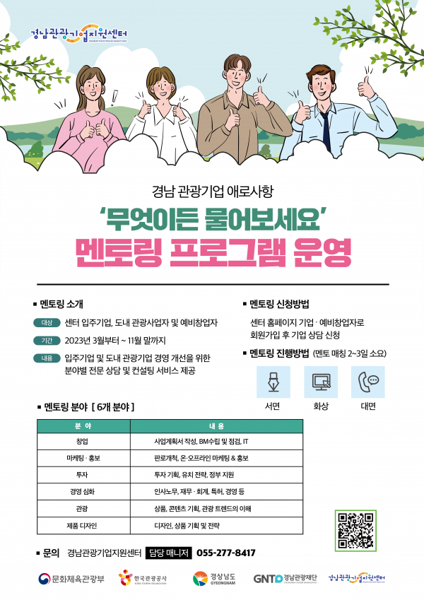 멘토링 신청은 경남에 거주하는 관광 분야의 예비창업자 및 도내 관광기업이면 올해 11월 말까지 경남관광기업지원센터 누리집을 통해 누구나 신청할 수 있다.