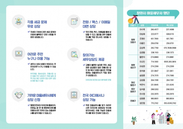 ‘마을세무사’제도란 복잡한 세무행정에 대한 전문지식이 부족하거나 과세불복 관련 비용부담이 어려운 시민들에게 무료로 세무 상담과 권리구제 지원 서비스를 해주는 제도로서 창원시에는 17명의 4기 마을세무사가 지정되어 있다.