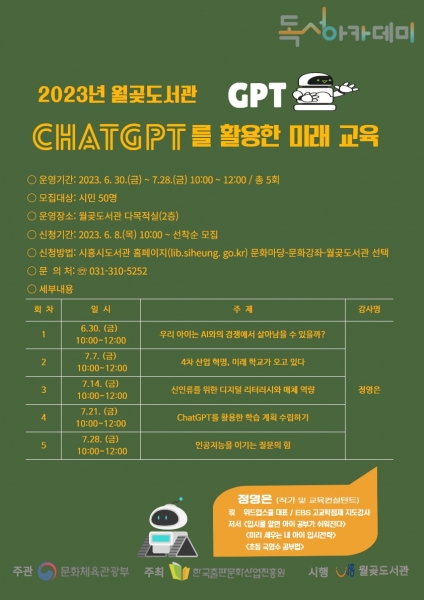 월곶도서관은 오는 30일부터 ‘챗 GPT를 활용한 미래 교육’이라는 주제로 총 5회에 걸쳐 독서아카데미 강연을 운영한다.
