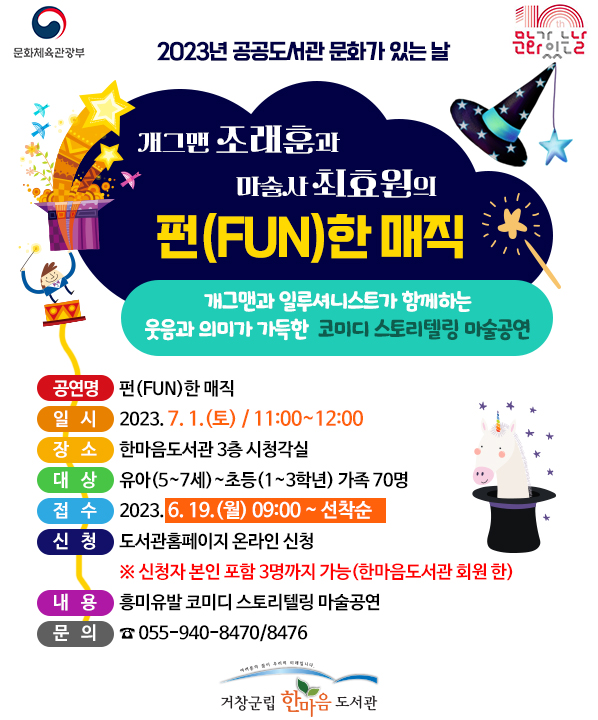 [금요저널] 거창군립한마음도서관은 ‘2023년 공공도서관 문화가 있는 날’ 공모사업에 선정돼 오는 7월 1일 토요일 오전 11시 ‘펀한 매직’ 공연을 개최한다.