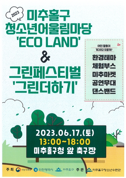 [금요저널] 인천시와 미추홀구가 주최하고 미추홀구청소년수련관이 주관하는 미추홀구청소년어울림마당 2회차 ‘Eco Land’, Green Festival ‘그린 더하기’가 오는 17일 오후 1시부터 미추홀구청 앞 축구장에서 개최된다.