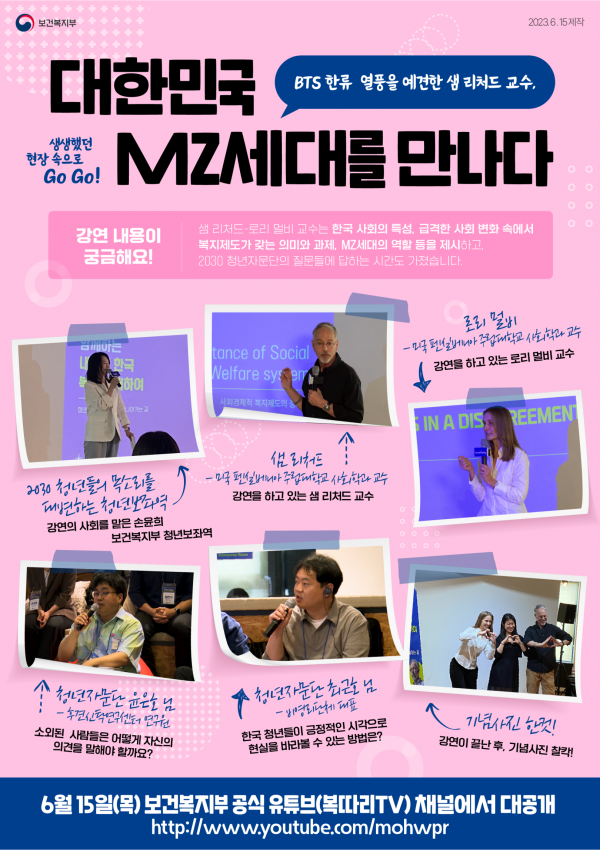 MZ 세대와 샘 리처드-로리 멀비 교수가 함께 한 본 강연은 6월 15일 보건복지부 공식 유튜브를 통해 영상으로 만나볼 수 있다.