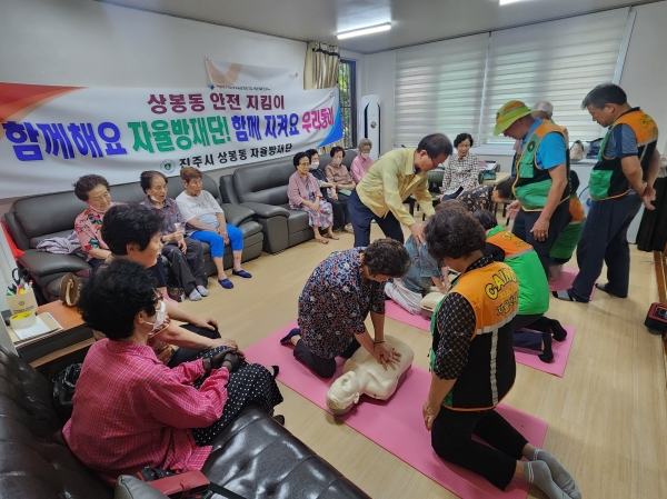 [금요저널] 진주시 상봉동 지역자율방재단은 15일 생활 속 안전사고 예방을 위해 관내 어르신을 대상으로 심폐소생술 교육을 실시했다.
