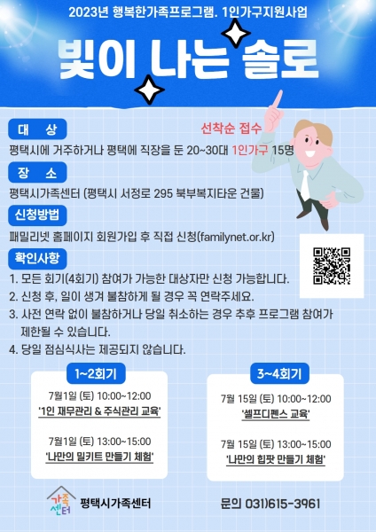 청년 1인가구 대상 : 행복한가족프로그램 1인가구지원사업 ‘빛이나는 솔로’ '빛이 나는 솔로' 프로그램은 경기도에서 지원하는 행복한가족프로그램 사업 중 하나로 가족관계 강화를 위해 다양한 유형의 가족을 대상으로 맞춤형 프로그램을 실시해 가족문제를 예방한다는 취지로 진행되고 있다.
