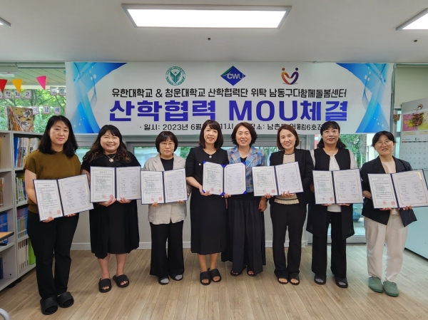 업무 협약식에는 남동구 6개 다함께돌봄센터 센터장과 유한대학교 아동보육학과 황소영 교수, 청운대학교 산학협력단 김현 교수가 참석했다.
