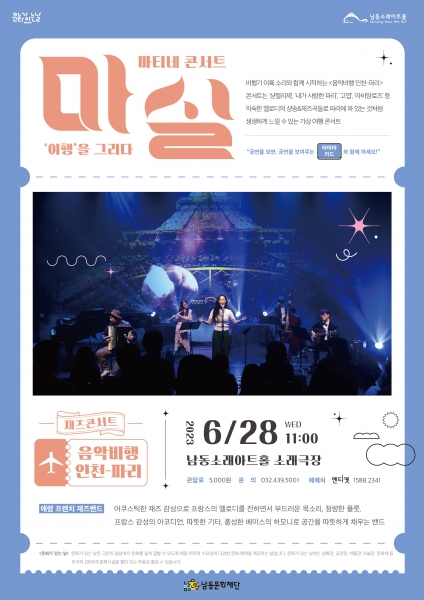 [금요저널] 인천 남동문화재단은 문화가 있는 날마다 진행하는 ‘마티네 콘서트 마실’ 6월 공연으로 애령 프렌치 재즈밴드의 ‘음악 비행 인천-파리’를 오는 28일 오전 11시 남동소래아트홀에서 개최한다고 19일 밝혔다.
