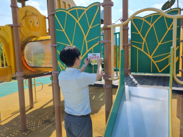 [금요저널] 거창군은 관내 실외 어린이 놀이시설 안전 취약 요소를 집중점검하고 여름철 화상주의 표지를 부착한다고 19일 밝혔다.
