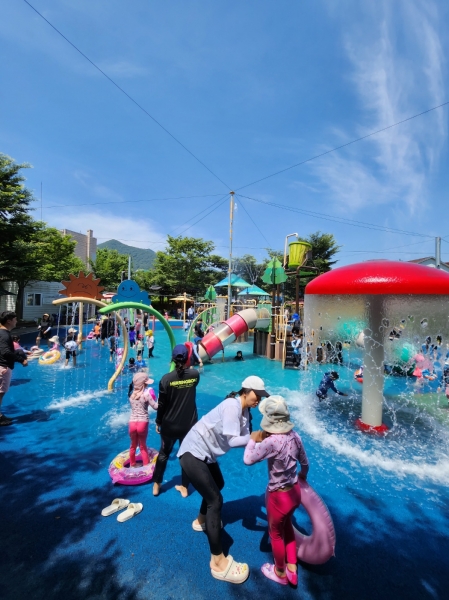 올해는 물놀이장의 변화를 주고자 에어바운스 쪽에 차광막과 평상을 설치해 뜨거운 햇살을 피하면서 편리하고 안전하게 물놀이를 즐길 수 있도록 시설을 개선했다.