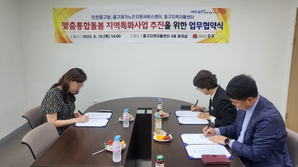 [금요저널] 인천시 중구는 ‘2023년 맞춤통합돌봄 지역특화사업’의 성공적 추진을 위해 사업 수행기관인 중구재가노인지원서비스센터, 중구지역자활센터와 협력 체계를 구축했다고 19일 밝혔다.