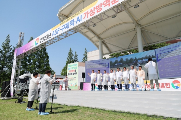 훈련은 함안군 함안면 양돈농가의 아프리카돼지열병 발생을 가상해 의심축 신고부터 이동제한, 초동대응, 정밀진단, 살처분, 통제초소·거점소독시설 설치, 확산대응, 사후관리, 종식까지 일련의 방역과정과 단계별 조치사항을 동영상과 현장시연을 통해 재현했다.