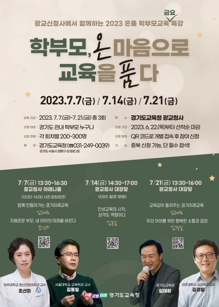 [금요저널] 경기도교육청이 가정의 인성교육 기능 회복과 자녀교육 역량 강화를 위해 2023 온품 학부모교육 특강 시리즈 ‘학부모, 온 마음으로 교육을 품다’를 운영한다.