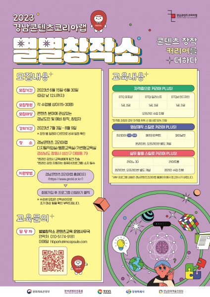 콘텐츠 창작 교육 프로그램인 ‘별별창작소’, ‘융복합발전소’는 문화체육관광부, 한국콘텐츠진흥원의 지원을 받아, 사업 수탁기관인 경남문화예술진흥원 경남콘텐츠코리아랩에서 오는 6월 30일까지 수강생을 모집해 교육을 추진한다.