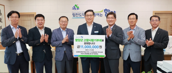 [금요저널] 함양군은 19일 오전 군수실에서 거창군 소재 4개 농협 임직원이 동참해 고향사랑기부금 1,100만원을 전달하는 기탁식을 가졌다고 밝혔다.