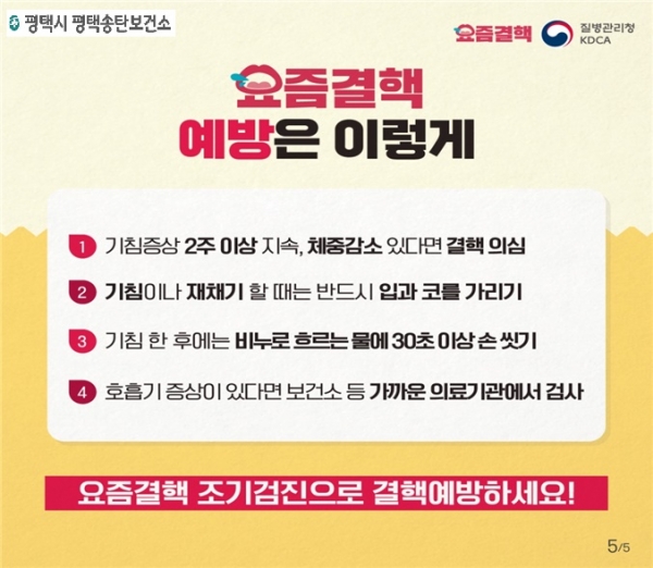평택보건소 관계자는 “결핵 관리 협력 의료기관과의 협업으로 전문성과 공공성을 높여 결핵 환자의 치료 및 접촉자 검진, 잠복 결핵 감염 치료를 철저히 해 결핵 발병을 예방하고 전파를 차단해 체계적인 결핵 관리가 이루어지도록 최선을 다하겠다”고 말하며 또한 “결핵은 공기 중으로 감염되는 법정 감염병으로 2주 이상 기침이 지속되는 등 호흡기 증상이 있다면 의료기관을 방문해 결핵 검사를 받아 달라”고 당부했다.
