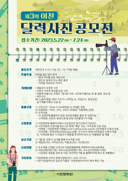 한편 이천문화원에서는‘이천달력사진공모전’은 2023년 5월 22일부터 2023년 7월 24일까지, ‘이천시영상공모전’은 2023년 5월 17일부터 2023년 7월 17일까지 작품을 접수를 받고 있으며 누구나 참여할 수 있다.