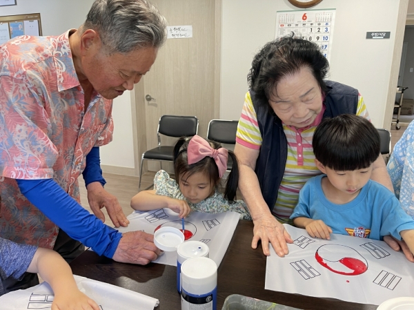 [금요저널] 평택시 세교동 관내 힐스테이트지제역 경로당 회원들은 지난 20일 단지 내 어린이집 원아 20여명과 태극기 만들기 프로그램을 함께 진행했다.