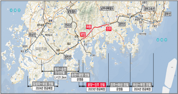 '24년에는 부전∼마산 복선전철의 개통으로 KTX-이음 고속열차가 운행되어 진주~광양 구간이 25분으로 단축되고 지역 간 교류와 남해안 관광산업을 활성화해 지역 균형발전을 촉진할 것으로 기대된다.