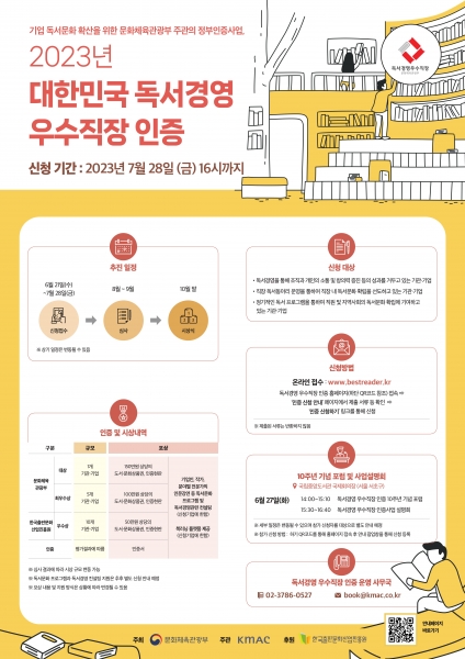 [금요저널] 문화체육관광부는 한국능률협회컨설팅과 함께 6월 21일부터 7월 28일까지 전국 기업과 기관을 대상으로 ‘2023년 대한민국 독서경영 우수직장 인증’ 신청을 받는다.