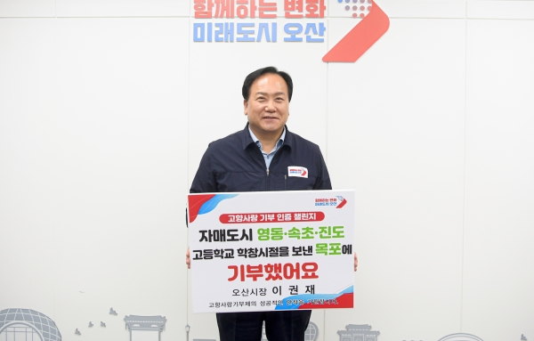 이병선 속초시장의 지명을 받은 이권재 오산시장은 자매도시인 충북 영동군, 강원 속초시, 전남 진도군과 고등학교 학창시절을 보낸 전남 목포시에 고향사랑기부금을 전달했다.