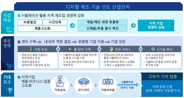 본 사업은 대구성서산단 내 거점센터를 구축하고 지역 중소·중견 기업들이 제품·기술 개발 시 시뮬레이션을 활용한 기술지원과 전문인력 양성을 위한 기술보급 및 확산을 추진한다.