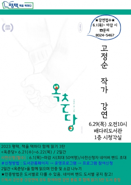 [금요저널] 평택시 시민독서운동 ‘평택, 책을 택하다’ 2023년 올해의 책 ‘옥춘당’ 고정순 작가 강연이 오는 29일 목요일 오전 10시에 배다리도서관에서 열린다.