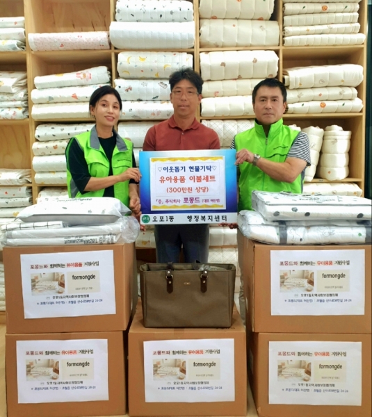 [금요저널] 광주시 초월읍에 소재하는 영유아 침구 전문 브랜드 ㈜포몽드는 19일 저소득 영유아 가정을 돕기 위해 500만원 상당의 영유아용품 세트를 오포1동 행정복지센터에 기탁했다.