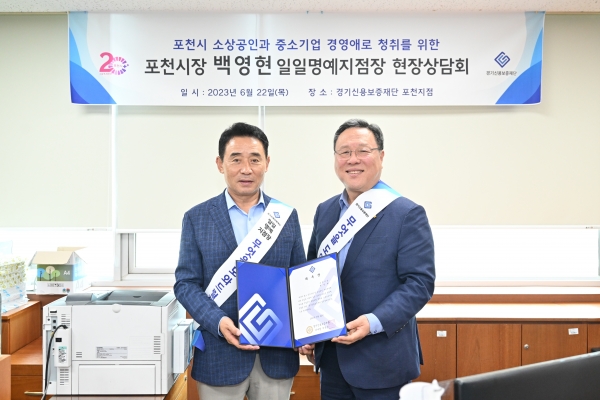 [금요저널] 백영현 포천시장은 지난 22일 경기신용보증재단 포천지점을 방문해 기업애로를 청취하고 일일명예지점장으로 현장상담을 진행했다.
