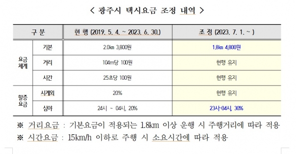 [금요저널] 광주시는 다음달 1일 오전 4시부터 지역 내 중형택시 기본요금을 현행 2km 3,800원에서 1.8km 4,800원으로 인상한다고 22일 밝혔다.
