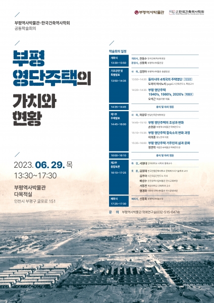 손민환 부평역사박물관 학예연구사가 ‘부평 영단주택의 조성과 변화’, 이의중 옹노만어 대표가 ‘부평 영단주택 합숙소의 변화 과정’, 정연학 국립민속박물관 학예연구관이 ‘부평 영단주택 거주민의 삶과 문화’를 주제로 발표를 진행한다.