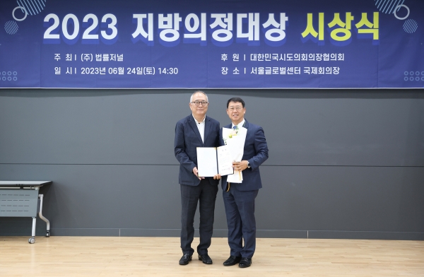 ‘2023 지방의정대상’은 지방자치발전과 지역주민의 삶의 질 향상에 기여한 지역정치인의 모범사례를 발굴하고 원칙과 공정의 가치 실현을 위해 의정활동을 펼친 지방의회의원을 시상하기 위해 마련됐으며 ㈜법률저널이 주관했다.