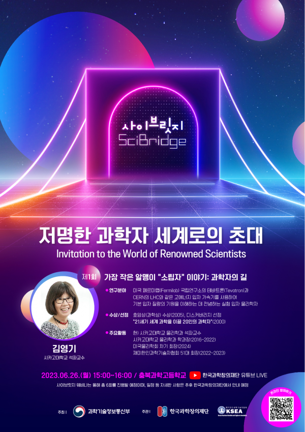 제51대 재미과기협 회장이자 미국 디스커버리지가 선정한 "21세기 세계 과학을 이끌 20인의 과학자"와 "호암 과학상" 수상자로 이름을 올린 김영기 시카고대학교 석좌교수가 6월 26일 충북과학고등학교 온·오프라인 강연으로 사이브릿지 프로젝트의 첫 문을 연다.