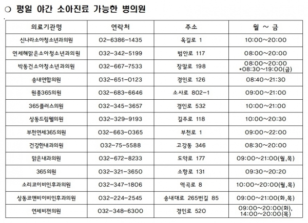 평일 야간 진료가 가능한 신나라소아청소년과읜원 10:00~20:00, 연세해맑은소아청소년과의원 08:00~20:00, 박동건소아청소년과의원 08:00~20:00, 송내연합의원 08:40~21:30 원종365의원 09:00~21:00 365플러스의원 10:00~21:00 상동드림웰의원 10:00~20:30 부천연세365의원 09:00~22:00 건강한내과의원 08:30~20:00 맑은내과의원 09:00~21:00 365의원 09:30~20:20 소리코이비인후과의원 10:00~20:00 상동코앤비이비인후과의원 09:00~21:00 연세비젼의원 09:00~20:00, 오후 2시~20:00까지 운영한다.