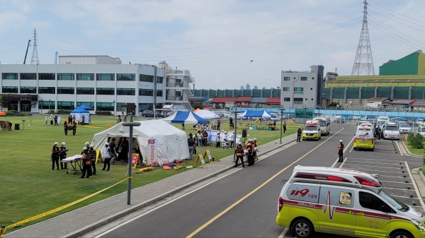 훈련은 HD현대인프라코어에서 가스 폭발에 의한 건물 붕괴 및 화재로 50여명의 인명피해가 발생한 상황을 가정해 재난현장 초기 환자분류 및 처치, 환자 분산 이송, 보건소의 현장응급의료소 운영 능력 등 구급 대응 강화에 중점을 두고 진행됐다.