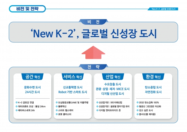 또한, 글로벌 도시의 성공 요인을 반영하되 K-2 후적지는 세계 최고의 ICT를 기반으로 첨단산업 기반의 생산도시를 지향하고 이들을 뛰어넘는 글로벌 미래도시를 목표로 새로운 가치를 창출하는 세계적인 도시를 만들고자 ‘New K-2’, 글로벌 신성장 도시라는 비전을 제시했다.