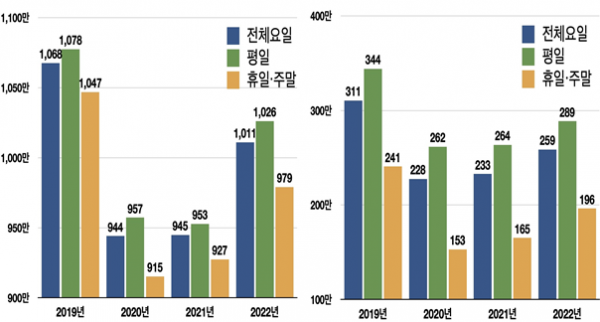 `22년 대도시권 광역교통 조사 결과에 따르면, 연평균 일일 광역 통행량은 코로나-19 확진자수 감소와 사회적 거리두기 종료등 영향으로 전년대비 7.0% 증가했다.