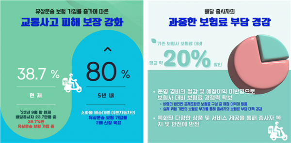 향후 공제조합은 배달 종사자에게 특화된 월단위·시간단위 보험상품을 시중 대비 약 20% 저렴하게 제공해 배달 종사자 가입률을 5년 이내 80%까지 끌어올릴 계획이며 이는 배달 종사자뿐만 아니라 국민들의 안전성 향상에도 기여할 것으로 전망된다.