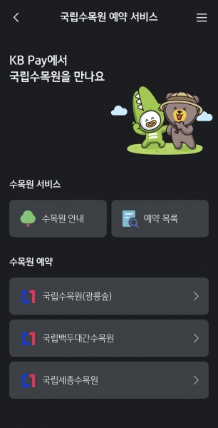 KB페이를 통한 예약서비스는 전체 메뉴에서-편의기능-국립수목원 예약 서비스를 선택하고 서비스 이용 동의 절차를 거쳐 진행하면 된다.
