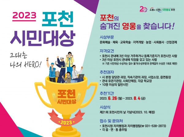 [금요저널] 포천시는 8월 4일까지 6주간 ‘2023 포천시민대상’ 후보자 추천 접수 기간을 운영한다.