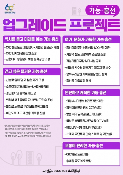 [금요저널] 의정부시는 시 승격 60주년을 맞이해 시민들의 삶의 환경을 한 단계 개선하기 위한 ‘의정부 업그레이드 프로젝트’의 가능·흥선편 세부계획을 28일 발표했다.